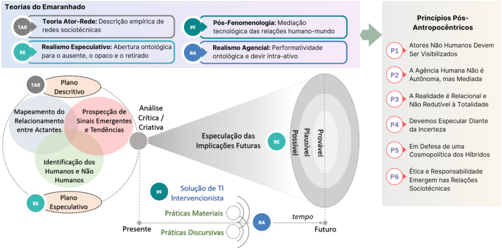 A partir desse enquadramento, o grupo de pesquisa SaLT – Social and Learning Technologies, do Programa de Pós-Graduação em Informática da UNIRIO, desenvolveu uma abordagem própria que une o Design Especulativo e as Teorias do Emaranhado. Essa proposta, denominada Speculative Entangled Design (SpED), assume o design como prática ontológica e performativa, orientada por uma perspectiva pós-antropocêntrica e relacional.